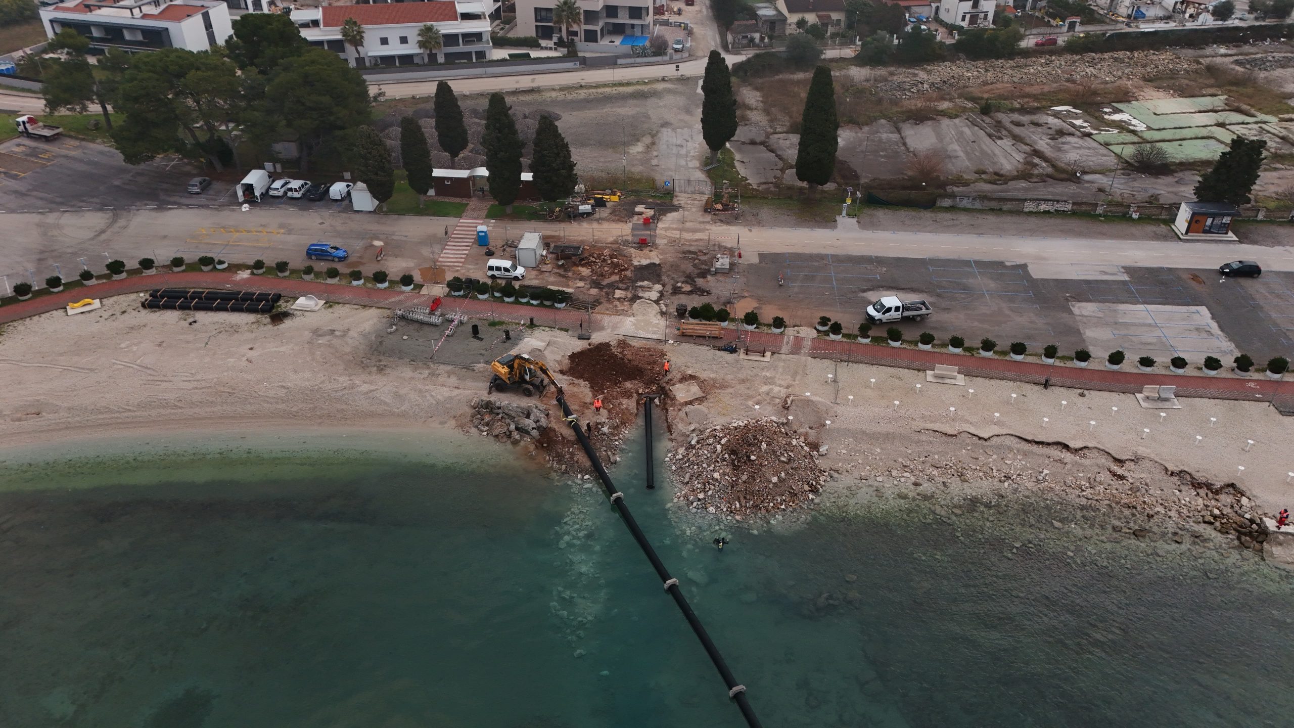 “Do sada su izvedeni radovi iskopa i pripreme rova cijele dionice (kopnene i podmorske), te polaganja kopnene sekcije cijevi u rov kao i betoniranje zaštitne obloge. Pojedinačne PEHD cijevi promjera 630mm duljine 13,5m termičkim varenjem su spojene u punu duljinu sekcije. Trenutno izvodimo radove montaže armirano betonskih utega, odnosno opteživača na podmorsku sekciju cijevi, a nakon toga ćemo pristupiti polaganju cijevi u rov. Ugradnja cjevovoda, odnosno polaganje cjevovoda na morsko dno, predviđeno je uz pomoć ronioca i plovila uz konstantnu kontrolu radijusa zakrivljenosti cjevovoda. Navedenom tehnologijom se potapa cjelovita duljina cjevovoda, na način da se cjevovod opterećen betonskim opteživačima postupno puni morem s jednog kraja. Nakon uspješnog polaganja podmorske sekcije cijevi u rov pristupit ćemo radovima betoniranja zaštitne obloge cijevi.” opisao nam je operativni voditelj radova Zvonimir Ćenan.