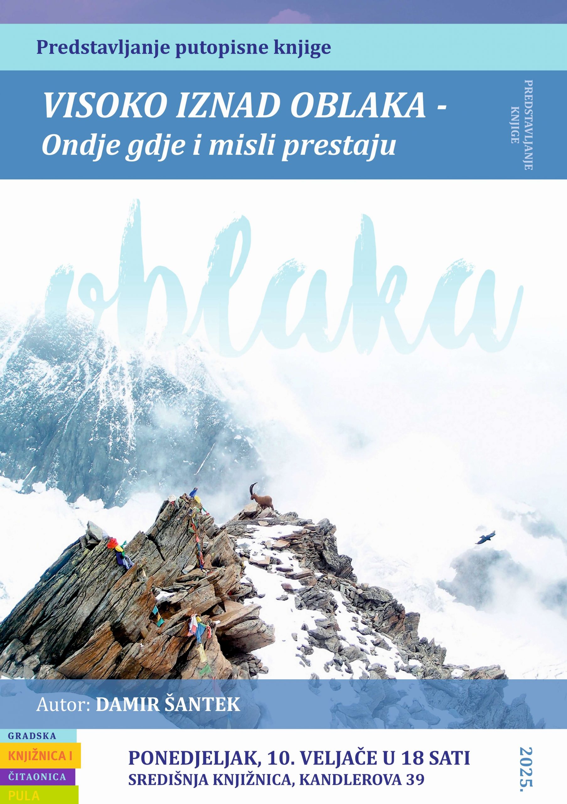 U ponedjeljak, 10. veljače 2025. u dvorani Gradske knjižnice i čitaonice Pula gostuje Damir Šantek koji će predstavii svoju novu knjigu Visoko iznad oblaka – ondje gdje i misli prestaju.