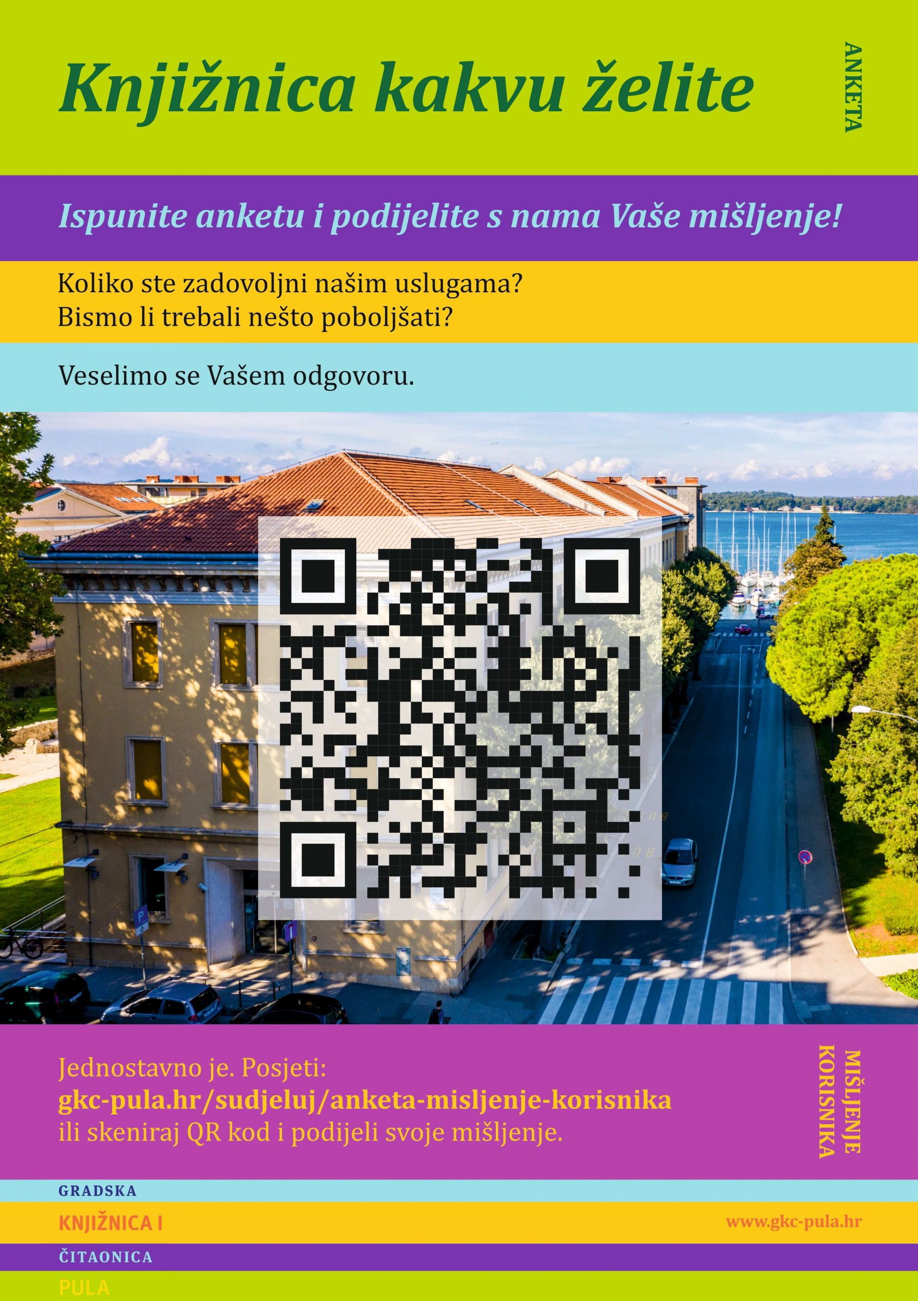 Gradska knjižnica i čitaonica Pula poziva sve građane, bez obzira na to jesu li korisnici knjižnice ili nisu, da sudjeluju u istraživanju koje provodi s ciljem poboljšanja knjižničnih usluga i prilagodbu knjižnice potrebama zajednice. Povratni odgovor ključan je za unapređenje knjižničnih usluga, proširenje sadržaja i usmjeravanje razvoja Knjižnice.