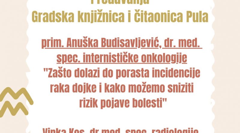 U okviru programa u Gradskoj knjižnici i čitaonici Pula u utorak, 18. ožujka 2025. bit će održana dva predavanja:”Zašto dolazi do porasta incidencije raka dojke i kako možemo smanjiti rizik pojave bolesti” prim. Anuške Budisavljević, dr. med. specijalistice internističke onkologije i “Uloga slikovnih metoda u dijagnosticiranju raka dojke” dr. med. Vinke Kos, specijalistice radiologije. Predavanja počinju u 18 satii otvorena su za javnost.