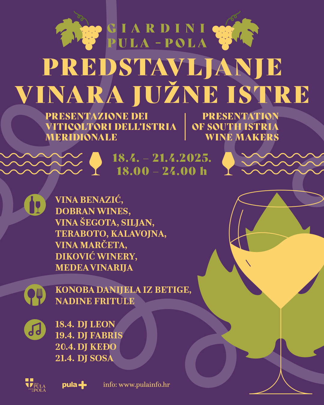 Od petka 18. travnja do ponedjeljka 21. travnja od 18.00 sati do ponoći uskrsni vikend bit će u Puli u znaku manifestacije na kojoj će se predstaviti devet vinara južne Istre i to vina: Benazić, Dobran, Šegota, Siljan, Teraboto, Marčeta, Kalavojna, Diković i Medea vinarija.