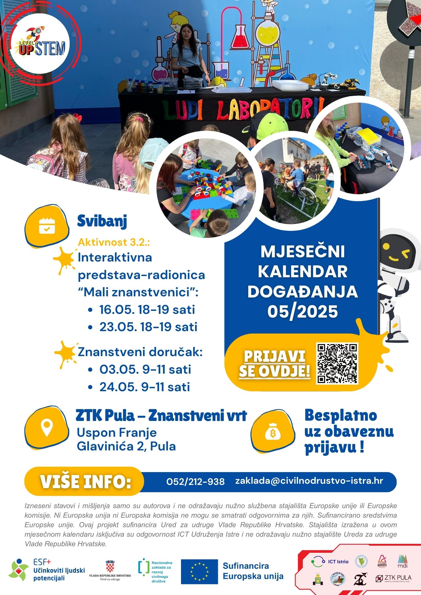Detaljan mjesečni kalendar aktivnosti te više o projektu moguće je pratiti na sljedećem linku: https://www.civilnodrustvo-istra.hr/projekti/detaljnije/level-up-stem-istrazhi-nauchi-stvori