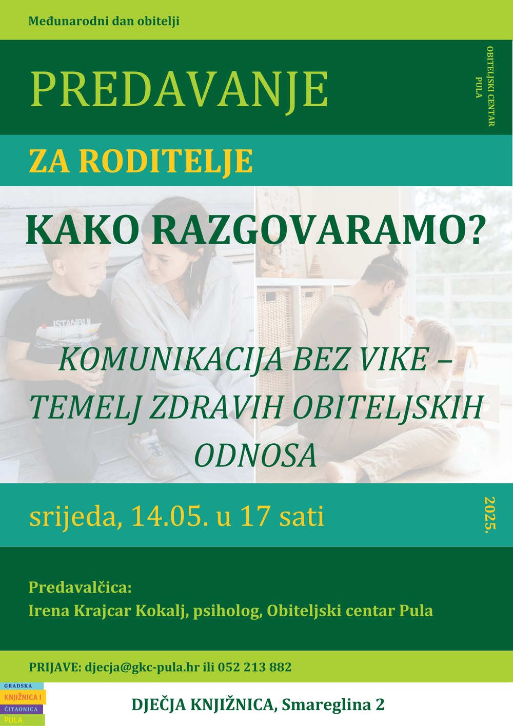 Pitanja su na koja ćemo zajedno potražiti odgovore na nadolazećem predavanju za roditelje u Dečjoj knjižinci koje organiziramo s Obiteljskim Centrom, Podružnicom Istarskom: u povodu Međunarodnog dana obitelji, u srijedu, 14. svibnja 2025. od 17 sati psihologinja Irena Krajcar Kokalj govorit će o jednoj od najvažnijih, često i najizazovnijih tema roditeljstva – komunikaciji unutar obitelji. Uz spomenuto, osvrnut ćemo se na navike koje razvijamo nesvjesno, poput vikanja, prijetnji ili ignoriranja, i pokazati kako one oblikuju emocionalni svijet djeteta – od najranije dobi.