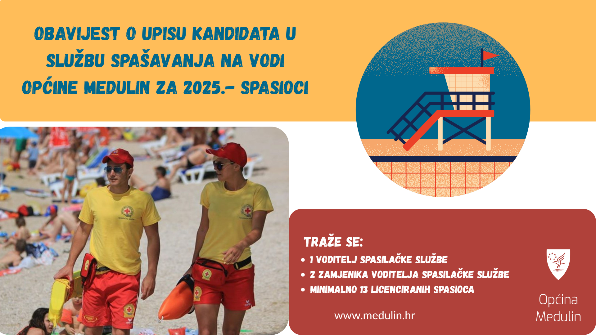 OBAVIJEST O UPISU KANDIDATA U SLUŽBU SPAŠAVANJA NA VODI OPĆINE MEDULIN za period od 05.06.2025. do 15.09.2025.