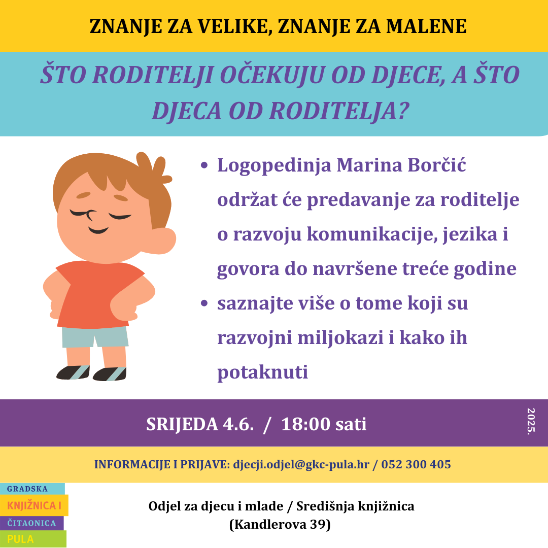 Na Odjelu za djecu i mlade Gradske knjižnice i čitaonice Pula nastavlja se program Znanje za velike, znanje za malene: u srijedu, 4. lipnja 2025.  logopedinja Marina Borčić održat će predavanje namijenjeno roditeljima djece vrtićke dobi.