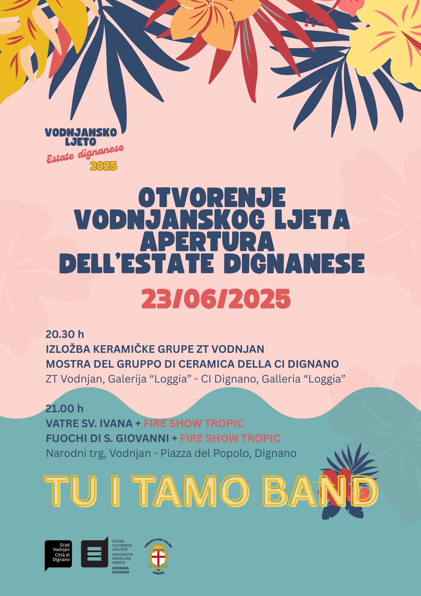 Tradicionalno, Ljeto otvaraju 23. lipnja Vatre sv. Ivana bogatim programom na Narodnom trgu u Vodnjanu. U 20.30 sati u Galeriji Loggia Zajednice Talijana Vodnjan bit će otvorena izložba keramičke grupe ZT Vodnjan. Uslijedit će paljenje vatre na trgu uz Fire show Tropic i nastup Tu i tamo banda.