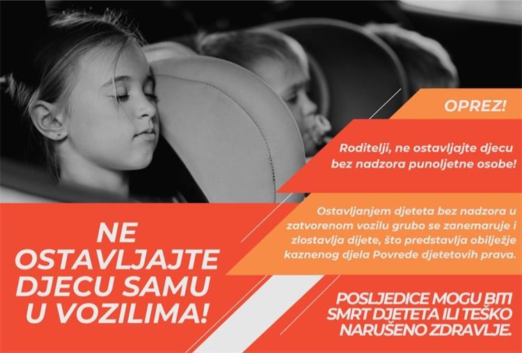 Budući da su ovih dana temperature visoke, kako bi se izbjeglo stradavanje djece, skrećemo pozornost roditeljima, kao i svima onima koji se brinu o djeci da postoje rizici i opasnosti od izlaganja djece suncu i visokim temperaturama te da čak i kraći boravak u ugrijanom vozilu može prouzročiti tragične posljedice.