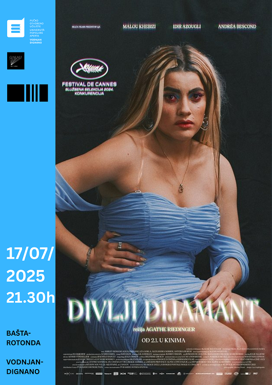 U četvrtak, 17. srpnja, s početkom u 21.30 sati u Bašti, na programu je 3. film ovogodišnjeg Art kina „Cineast“, „Divlja djevojka“ redateljice Agathe Riedinger. Odvažna, temperamentna, glasna i opsjednuta snovima o slavi, 19-godišnja Liane kandidatkinja je iz snova za svakog ozbiljnog producenta reality showa. Kada napokon dobije priliku na audiciji za emisiju Miracle Island, u kojem 15 mladih i zgodnih ljudi živi zajedno u kući na plaži, čini se da je uspjeh iza ugla. Prvi film francuske redateljice Agathe Riedinger britki je presjek današnje kulture instant zvijezda, društvenih mreža i influencera, u kojoj biti viđen znači postojati, a ispunjenost se može postići tek dosezanjem svetoga grala slave. Ulaz je besplatan, a u slučaju kiše ili vjetra projekcija će se održati u Domu mladih.