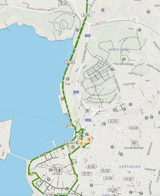 Ostatak trase je sljedeći: Tršćanska — Starih statuta — Riva — istočni kolnik Ul. Svetog Petra — Partizanski put — okret za 180° 5m prije raskrižja za skretanje za Pizzeriu Tivoli — Partizanski put — zapadni kolnik Ul. Svetog Petra — Riva — Flaciusova — ulazak na Forum — izlaz kroz pro. Svetog Nikole — Flaciusova — Danteov trg — Anticova — zapadni kolnik Laginjina — zapadni kolnik Giardini — Carrarina — skretanje desno 90° kod Gradske knjižnice — Amfiteatarska.