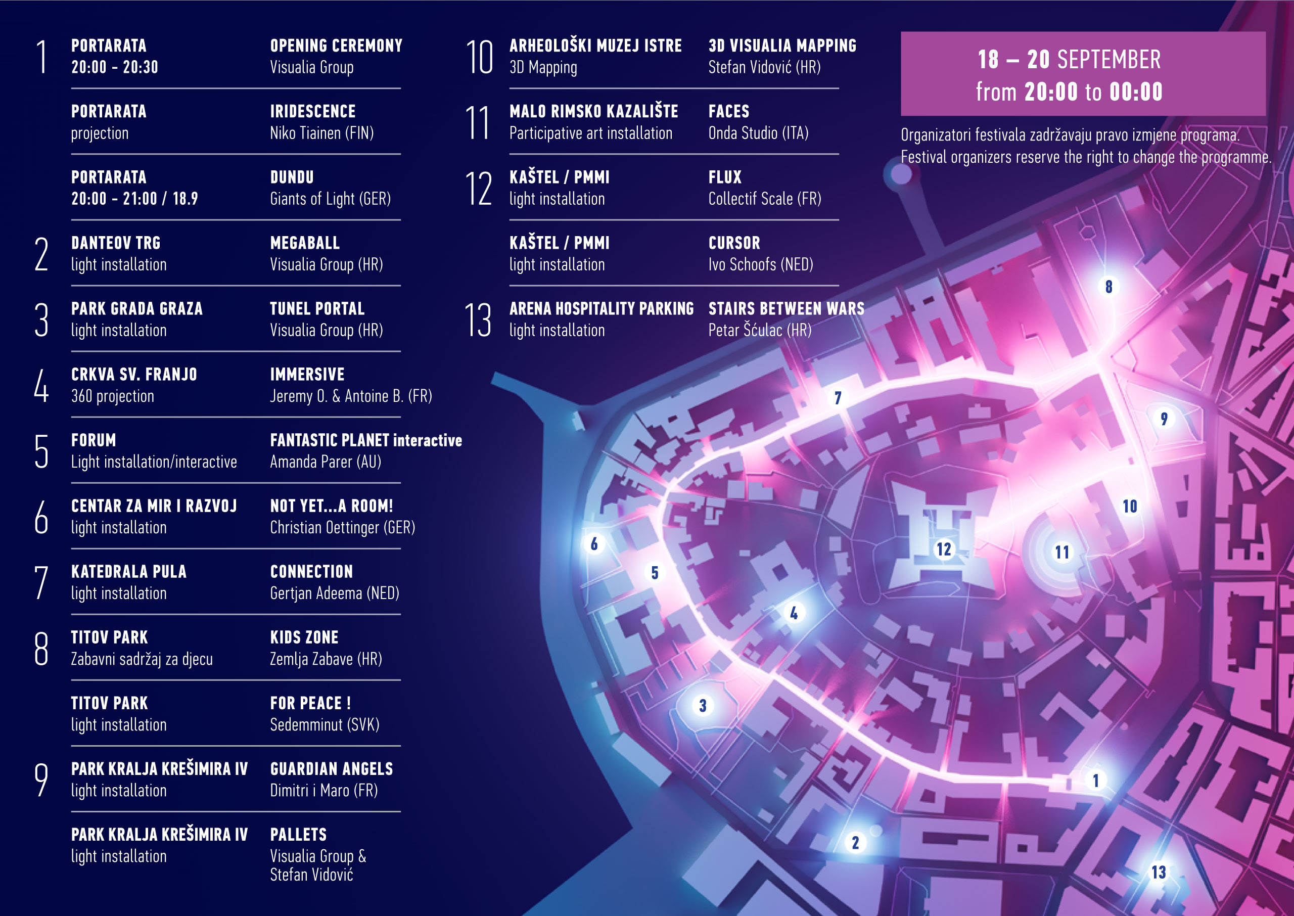 Za lakše praćenje programa na preostala dva dana Festivala posjetiteljima su dostupni programi na lecima koji će se dijeliti po gradu a koji se mogu preuzeti i u uredu TZ Pula na Forumu te na web stranici www.visualia-festival.com