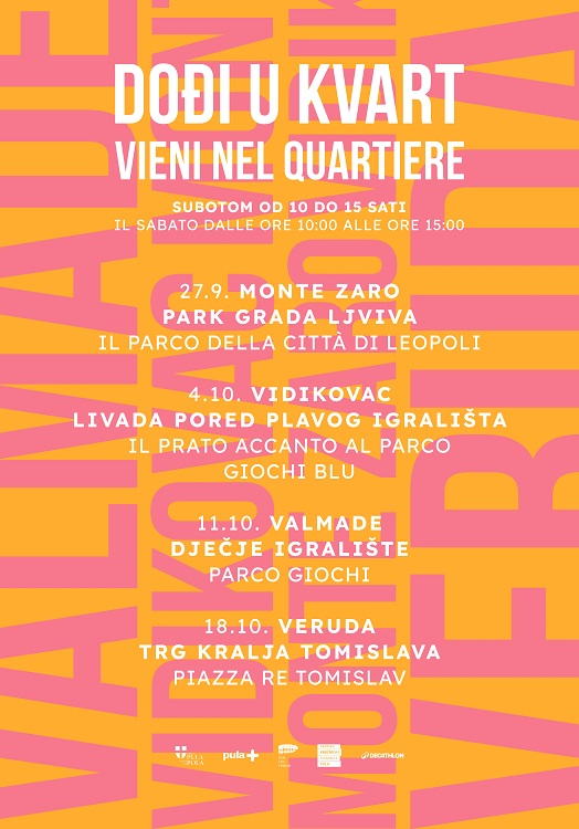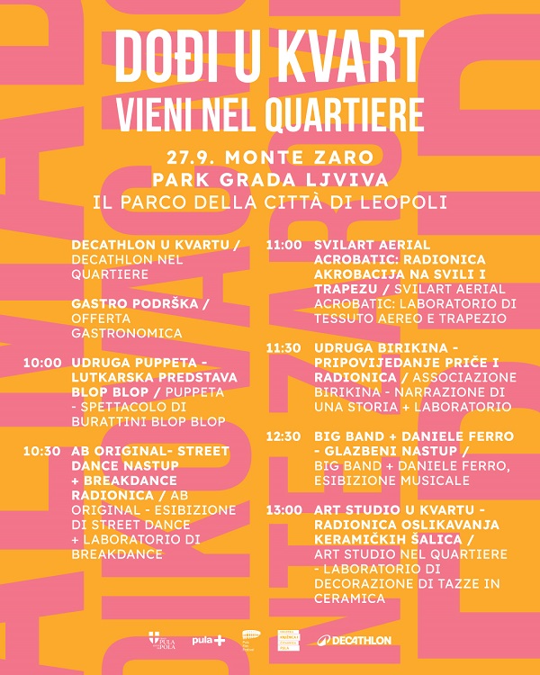 Manifestacija „Dođi u kvart – Vienni nel quartiere“ već tri godine za redom donosi mnoštvo kulturno-zabavnog i sportskog sadržaja u pulske kvartove. Ovogodišnje izdanje koje traje od 27. rujna do 18. listopada smjestit će se na Monte Zaro, Vidikovac, Valmade i Verudu gdje će se subotom od 10 do 15 sati na svakoj lokaciji pridružiti Decathlon s brojnim sportskim rekvizitima.