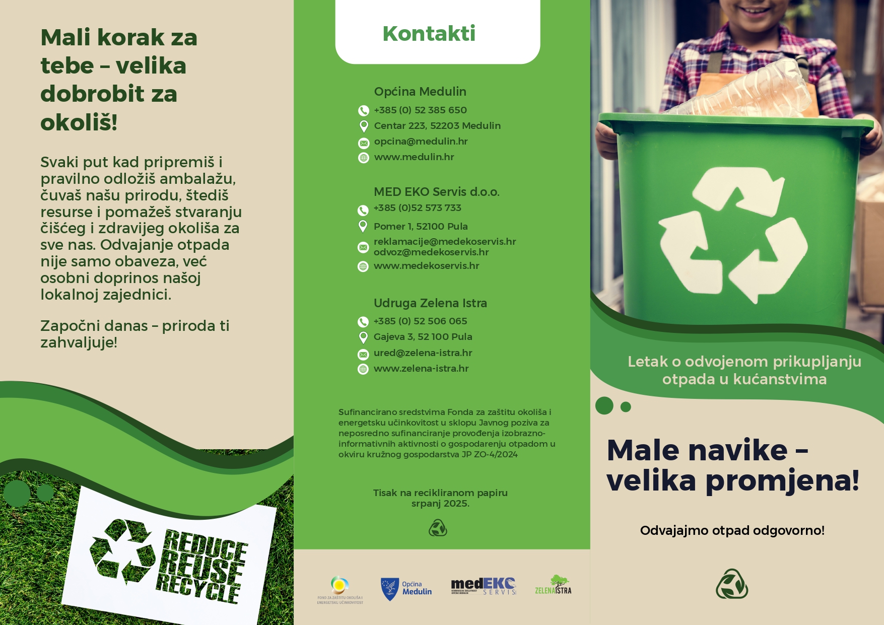 Izrađeno je 7.500 informativno-edukativnih letaka o odvojenom prikupljanju otpada, koje je komunalno poduzeće Med eko servis d.o.o. distribuiralo svim korisnicima komunalne usluge prikupljanja otpada. Letak prikazuje kako odvajanje otpada nije samo obaveza, već osobni doprinos našoj lokalnoj zajednici.