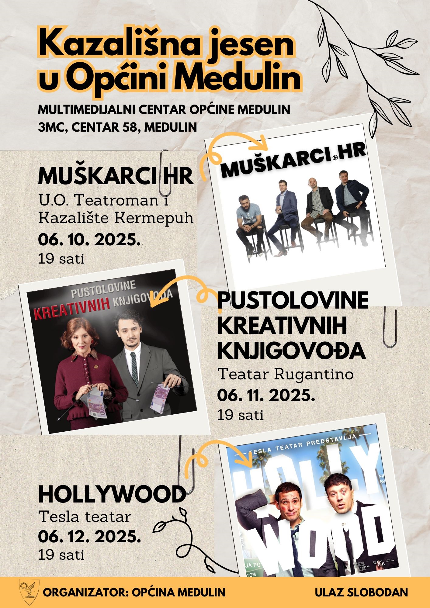 Općina Medulin i ove jeseni časti svoje mještane s tri urnebesne komedije, a kako  vam ni jedna od njih ne bi promakla iste  su na rasporedu 06. listopada, 06. studenog i 06. prosinca.