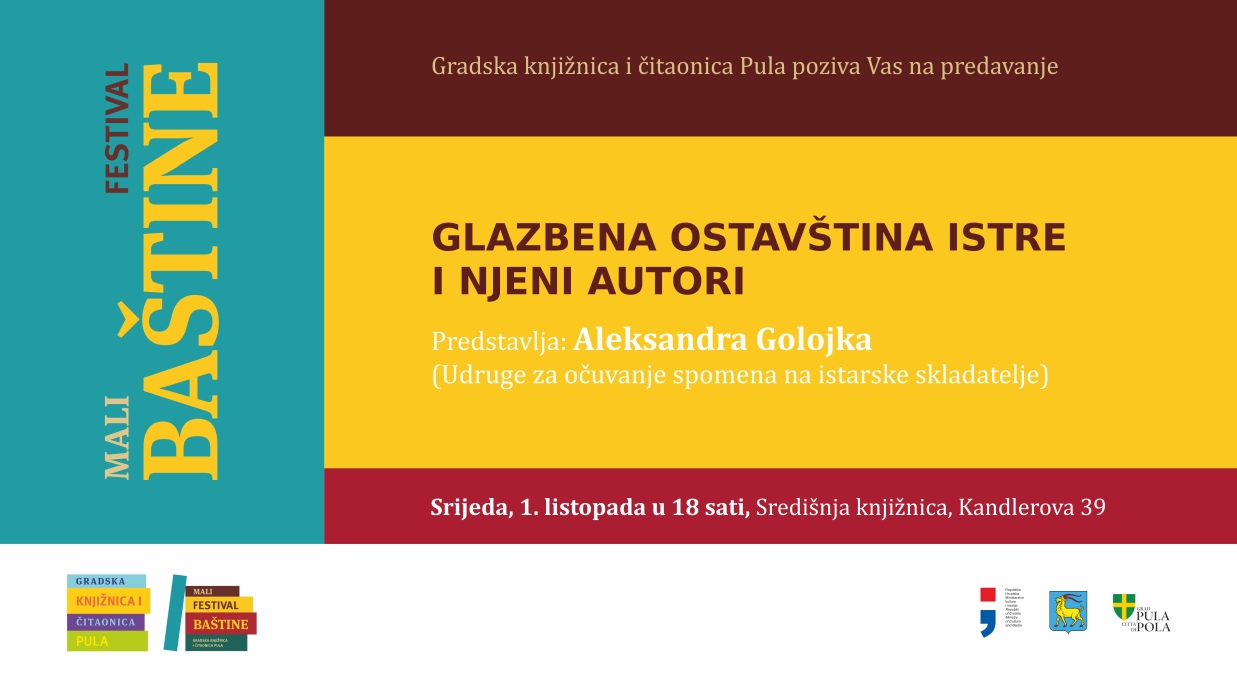 Popodnevni program Malog festivla baštine u srijedu, 1. listopada 2025. posvećen je temi glazbe. Ovom prigodom u dvorani Središnje knjižnice Aleksandra Golojka, predsjednica Udruge za očuvanje spomena na istarske skladatelje, održat će predavanje Glazbena ostavština Istre i njeni autori.