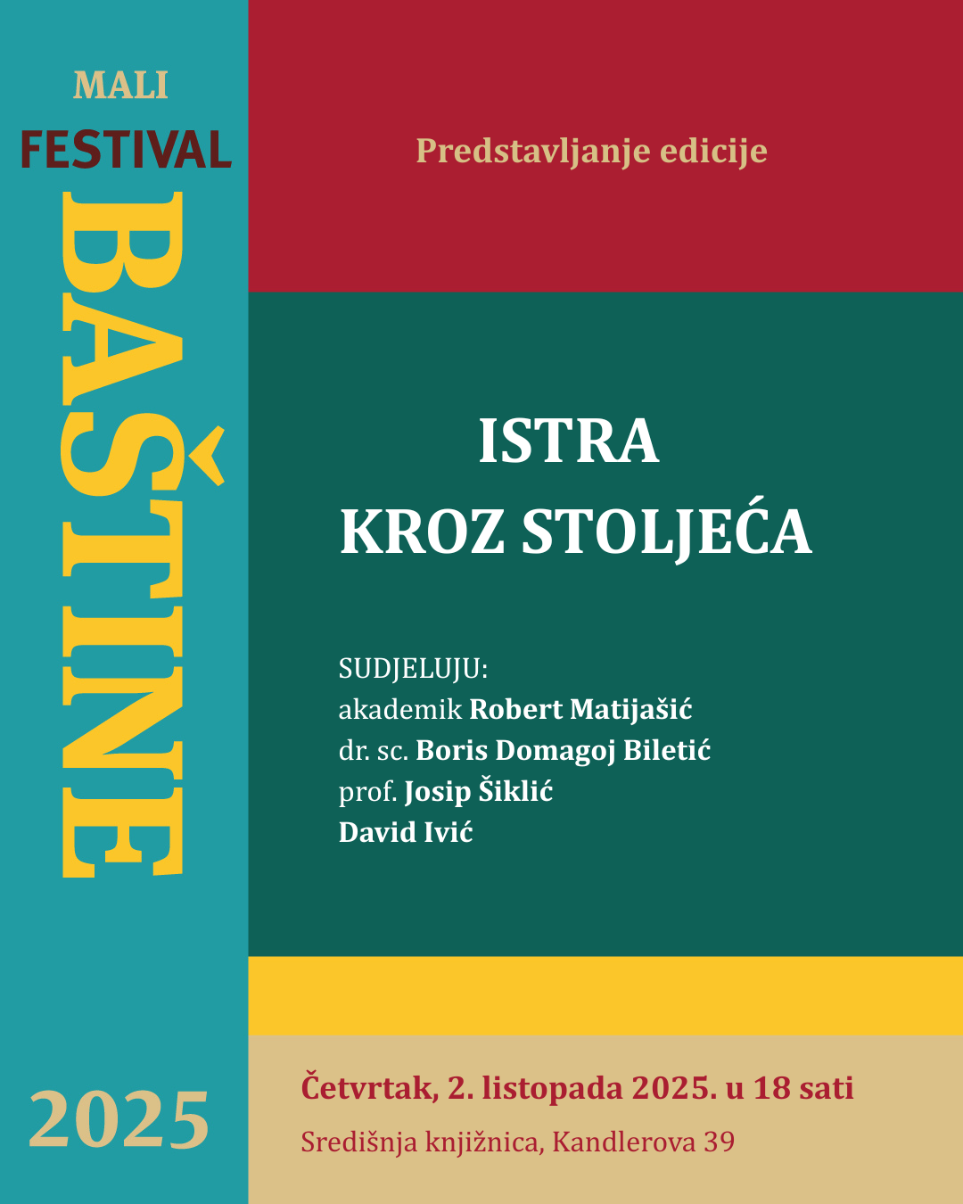 U okviru manifestacije Mali festival baštine u četvrtak, 2, listopada 2025. u dvorani Središnje knjižnice bit će predstavljena edicija Istra kroz stoljeća.