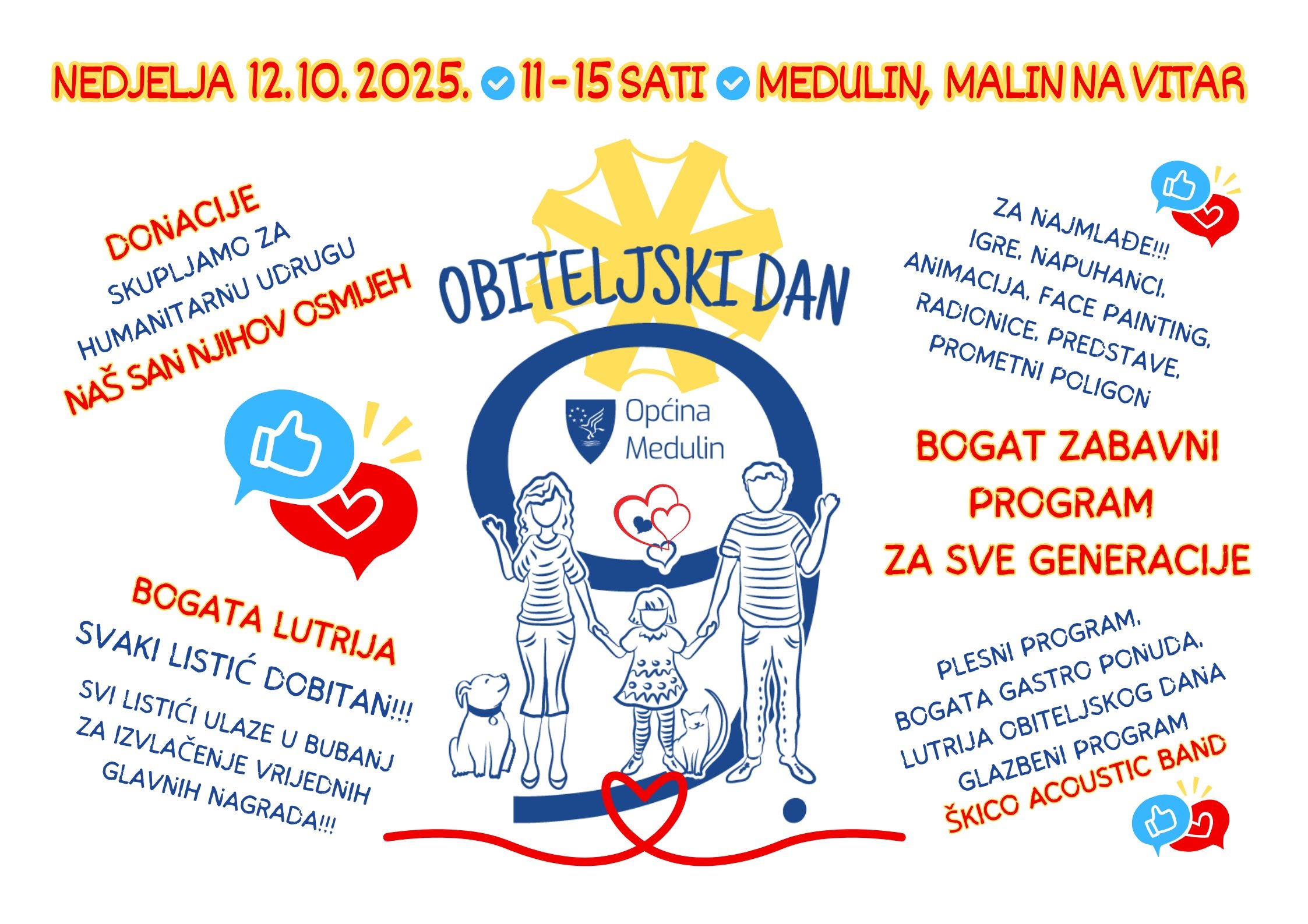 U vijećnici Općine Medulin načelnik Ivan Kirac sa suradnicima te predsjednik udruge „Naš san njihov osmijeh“ Igor Loparić najavili su program „9. Obiteljskog dana Općine Medulin“. Ovogodišnje izdanje zabavno-humanitarne manifestacije održati će se ove nedjelje, 12. listopada 2025. godine, od 11 do 15 sati, na uređenoj površini kod Malina na vitar na Medulinskoj rivi.
