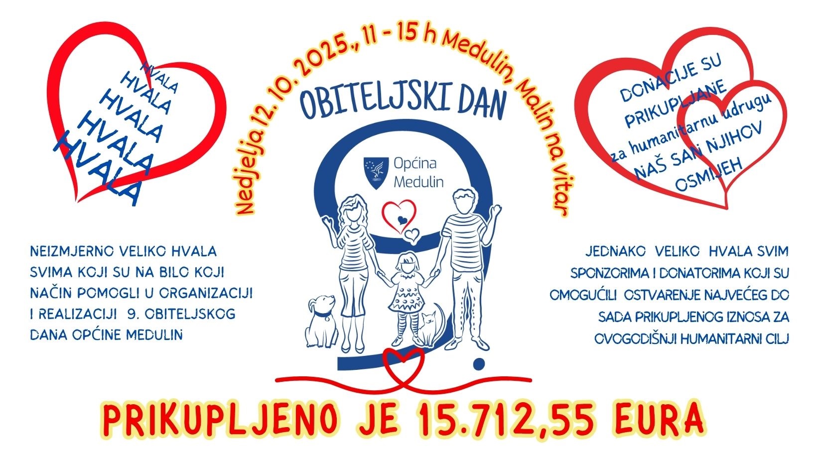 Općina Medulin još jednom zahvaljuje svim sponzorima i donatorima, fizičkim i pravnim osobama koji su donirali proizvode i usluge za bogatu lutriju ili donirali sredstva uplatom na žiro račun Općine. Velika zahvala ide i svima koji su pomogli u realizaciji 9. Obiteljskog dana. Ukupno je preko 150 osoba od čega više od 100 volontera svih generacija, svojim timskim radom i osobnim angažmanom omogućilo da 9. Obiteljski dan bude najljepši i najuspješniji do sada! Do iduće godine, do okruglog i jubilarnog 10. Obiteljskog dana, veliko, najveće HVALA od srca svima!