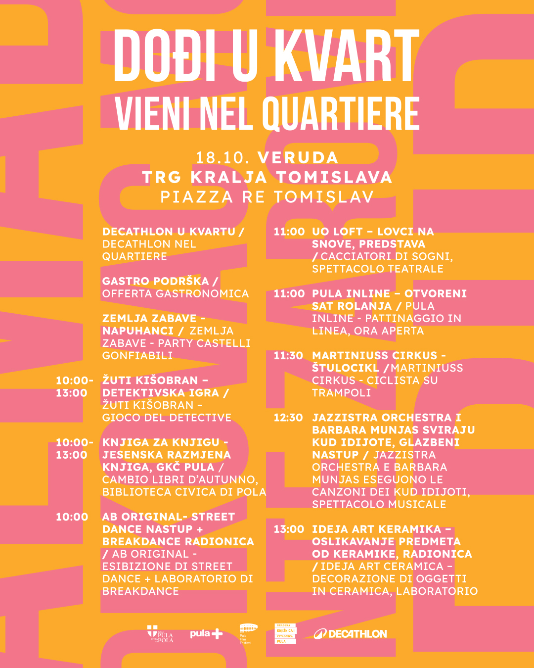 Zadnje organizirano kvartovsko druženje ove godine povodom manifestacije „Dođi u kvart – Vieni nel quartiere“ održat će se u subotu, 18. listopada, na Verudi na Trgu kralja Tomislava. Ovoga puta uz Decathlonove rekvizite i brojnu sportsku opremu koja je na raspolaganju od 10:00 do 15:00 sati stižu i napuhanci iz Zemlje zabave.