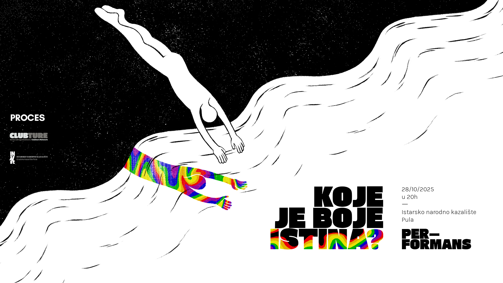 Plesni performans koji će izvesti Mateo Babić 28. listopada u 20 sati na Maloj sceni Istarskog narodnog kazališta završna je aktivnost Clubture CT-HR projekta “Koje je boje istina?” čiji je nositelj udruga Proces. Projekt se bavi problematikom patologiziranja seksualne orijentacije i pokušajima promjene seksualne orijentacije kroz takozvanu KONVERZIVNU TERAPIJU te predstavlja nužnu reakciju na duboko ukorijenjeni društveni fenomen koji još uvijek pogađa mnoge pripadnike LGBTIQ+ zajednice, osobito u zemljama gdje je spomenuta pseudoznanstvena intervencija LEGALNA ili pak DRUŠTVENO TOLERIRANA. Iako se u zemljama poput Hrvatske IPSO tehnike (engl. sexual orientation change interventions) ne prakticiraju u institucionaliziranom obliku, prisutnost na društvenoj i političkoj sceni, kao i tendencije podrške i provođenja od strane određenih grupacija te religijskih zajednica, i dalje ostavlja snažan trag na socijalnu integraciju LGBTIQ+ osoba te čije su posljedice po mentalno zdravlje POGUBNE, a mogu dovesti i do samoubojstva.