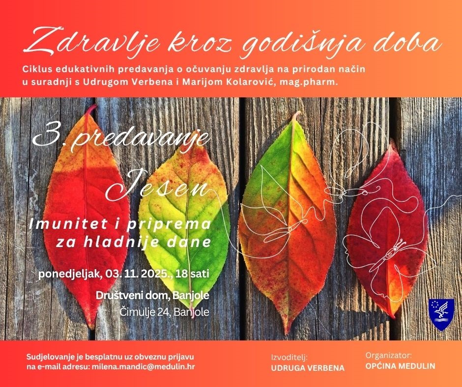 Općina Medulin u suradnji s Udrugom Verbena i farmaceutkinjom Marijom Kolarović poziva sve zainteresirane mještane i posjetitelje na edukativno predavanje „Jesen – imunitet i priprema za hladnije dane ”.