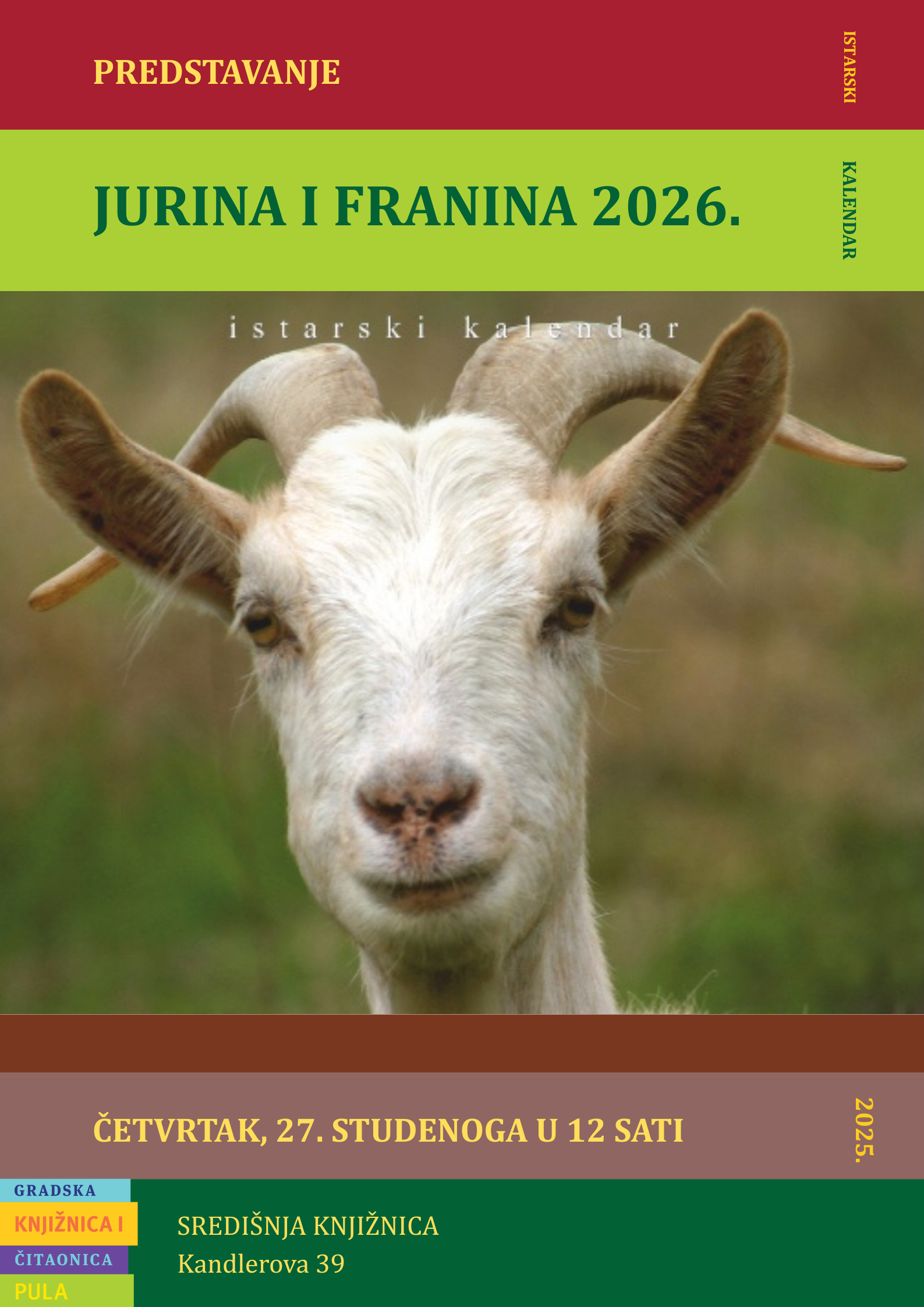 Istarski kalendar Jurina i Franina za 2026. godinu bit će predstavljen u četvrtak, 27. studenoga 2025. u dvorani Gradske knjižnice i čitaonice Pula.