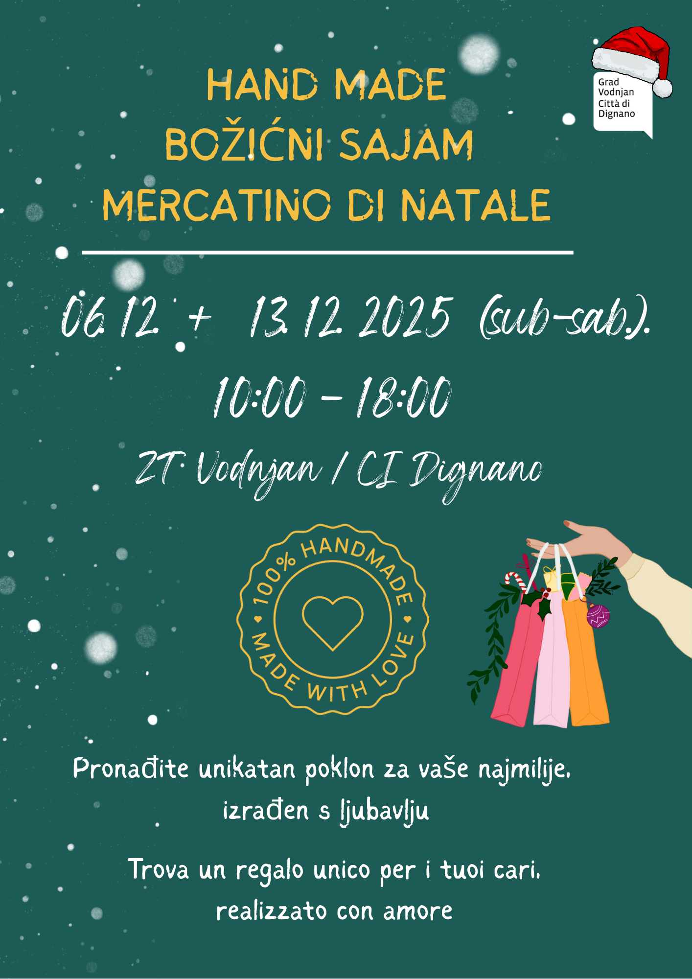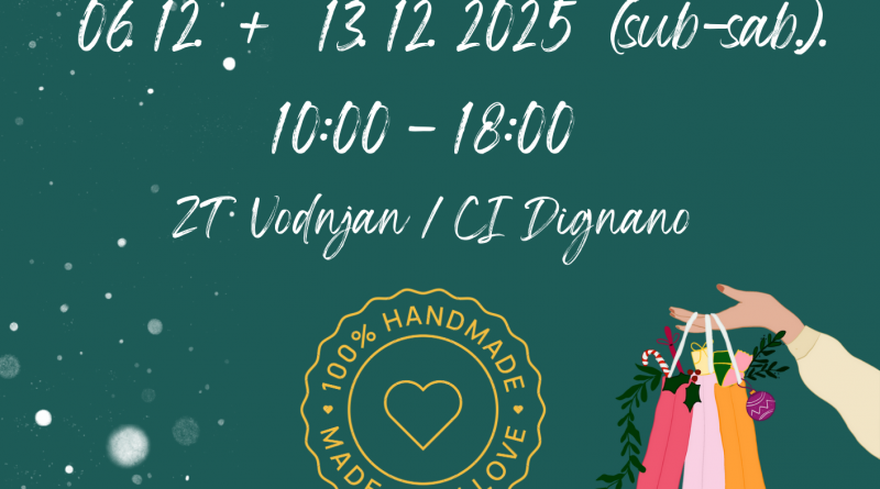 Hand made božićni sajmovi, na kojima svatko može pronaći unikatni poklon za svoje najmilije, izrađen ljubavlju, maštom i neograničenom kreacijom, održavaju se subotom, 6. prosinca i 13.prosinca, u Zajednici Talijana Vodnjan, u terminu od 10:00 do 18:00 sati.