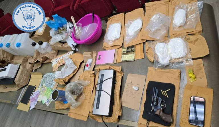 Temeljem naloga nadležnog suda, policijski službenici su 10. prosinca obavili pretrage stanova i vozila osumnjičenih na području Medulina te su pritom pronašli više pakiranja s ukupno 3.250,2 grama amfetamina, 3.645,5 grama marihuane te novac u vrijednosti više tisuća eura za koji se sumnja da potječe od prodaje droge. Policijski službenici pronašli su i mobitele, revolver marke Magnum cal. 357, više vrsta tekućih materija karakterističnih za proizvodnju amfetamina, rukavice, masku s filterima, digitalne vage, uređaje za vakumiranje i drugi pribor za proizvodnju i pakiranje droge, a pronađena je i bilježnica s evidencijom dugovanja.