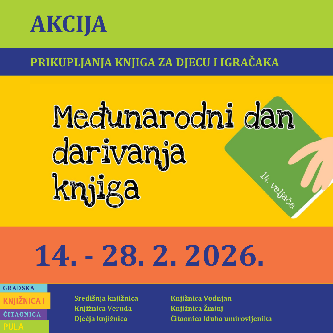 Pulska gradska knjižnica poziva građane, institucije, ustanove, udruge da u razdoblju od 14. do 28. veljače 2026. donesu očuvane slikovnice, knjige i stripove za djecu ili obrazovne i društvene igračke i igare u Središnju knjižnicu, Dječju knjižnicu, Knjižnicu Veruda, Čitaonicu kluba umirovljenika, Knjižnicu Vodnjan ili Knjižnicu Žminj. Kao i prethodnih godina, donirana knjiga možete se i zamijeniti nekom od darovanih u akciji. Po završetku akcije, knjižničari će za prikupljene knjige i ostalu darovanu građu pronaći nove čitatelje.