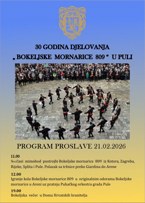 Pozivamo sve zainteresirane sugrađane i posjetitelje da se pridruže ovoj svečanosti, poprate mimohod gradskim ulicama te uživaju u nastupu Bokeljske mornarice u jedinstvenom ambijentu pulske Arene.
