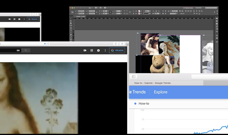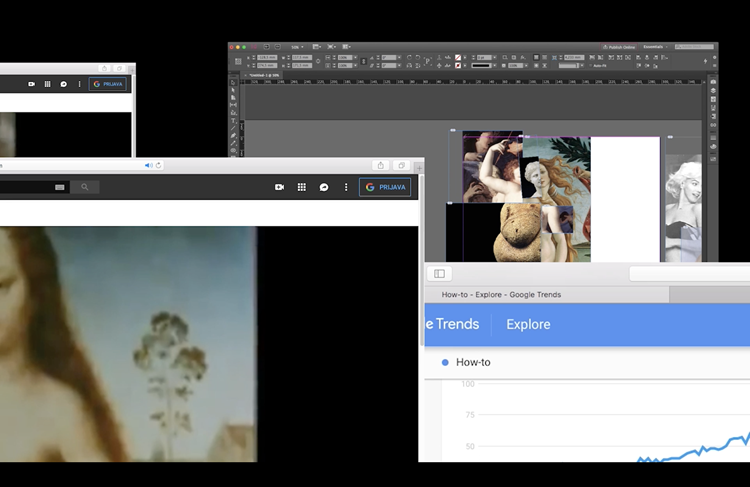Screen iz 2021. koja se sastoji od pet simultanih videoprojekcija na plohe koje su u prostoru razmještene na način da oponašaju otvorene prozore na radnoj površini računala (nalazi se u kolekciji MMSU, Rijeka).