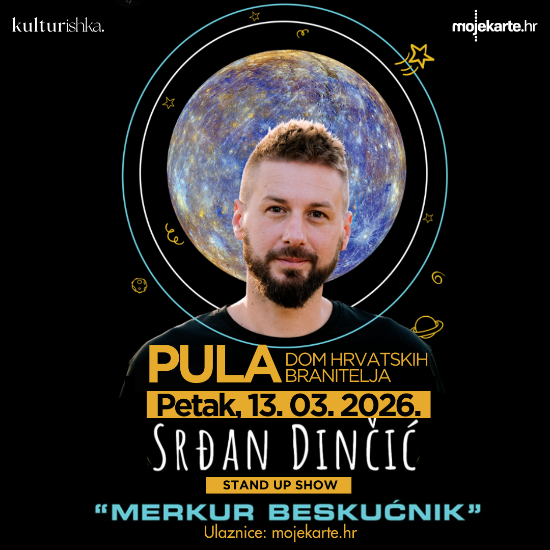 Ako vam treba mnogo smijeha i pozitivne energije (a sigurno vam treba), dođite po svoju dozu u petak, 13. ožujka, u Dom hrvatskih branitelja u Puli. Ako baš morate plakati, plačite od smijeha uz Srđana Dinčića i njegov stand-up specijal „Merkur beskućnik“!