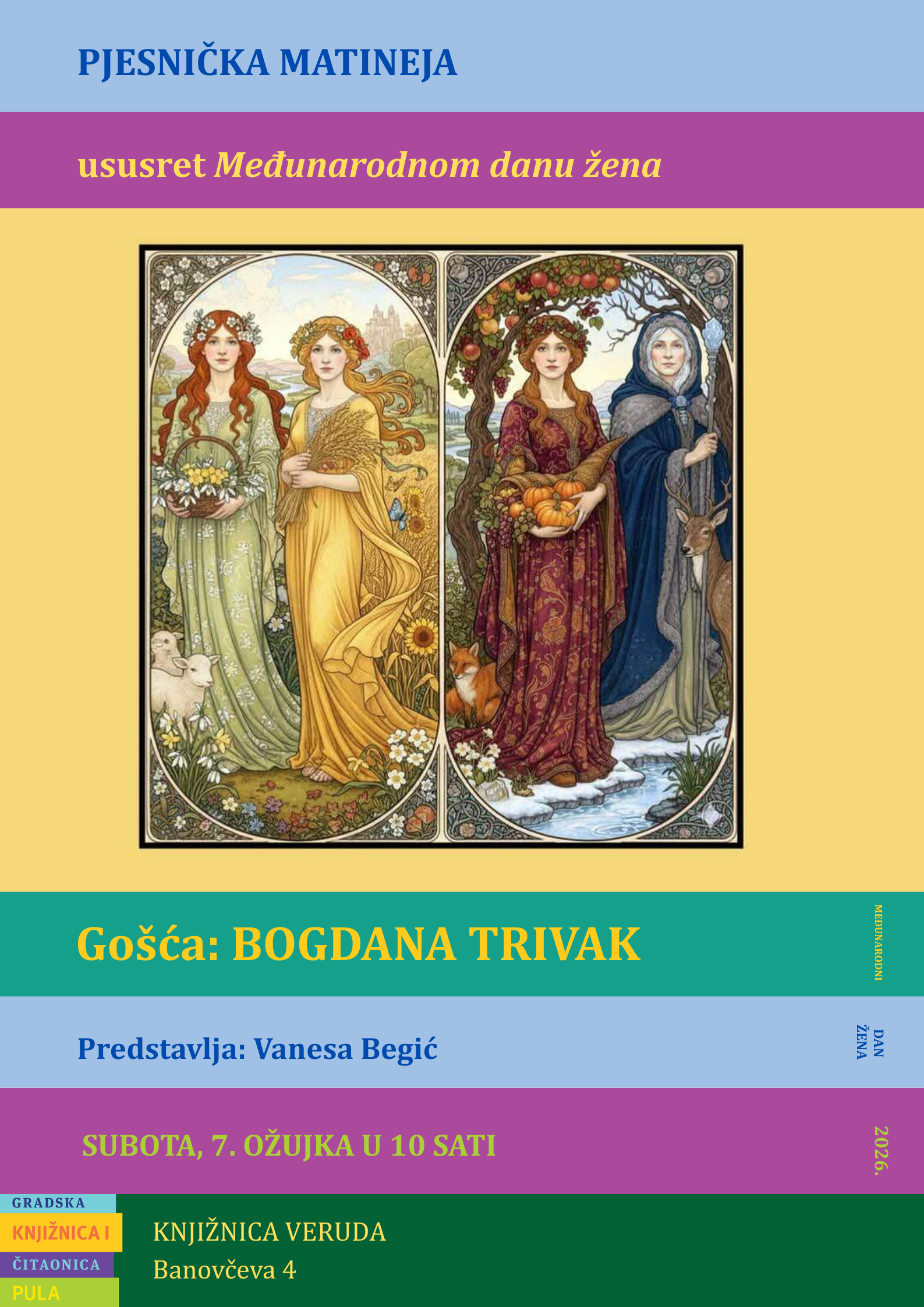 Ususret Međunarodnom danu žena, u subotu, 7. ožujka 2026. Gradska knjižnica i čitaonica Pula ugostit će u Knjižnici Veruda (Banovčeva 4) autoricu Bogdanu Trivak koja će urazgovoru s Vanesom Begić predstaviti svoje stvaralaštvo.