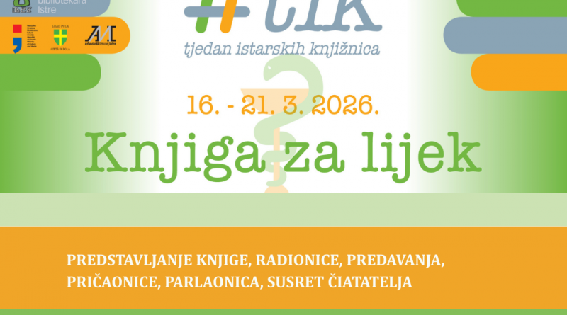 Društvo bibliotekara Istre u suradnji s istarskim knjižnicama i ove godine organizira manifestaciju Tjedan istarskih knjižnica – TIK, a koja će biti održanaod 16. do 21. 3. 2026. Ovogodišnji program Tjedna istarskih knjižnica posvećen je mentalnom zdravlju i odvijat će se pod sloganom “Knjiga za lijek”.