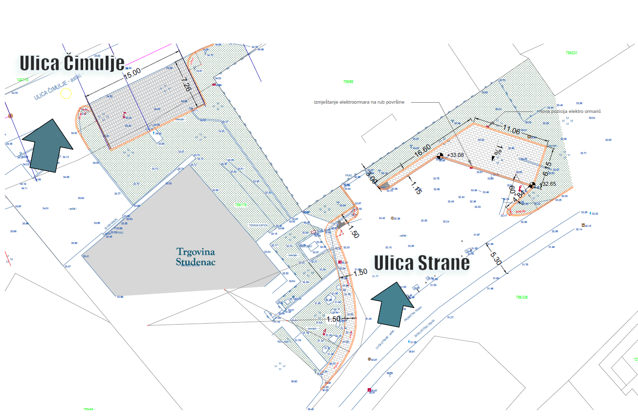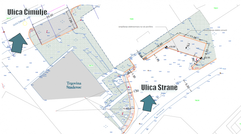 U ulici Čimulje planira se organizacija okomitog parkiranja za osobna vozila uz postojeću prometnicu, pri čemu će završna obloga parkirališta biti izvedena kao betonsko travno opločenje. U ulici Strane uredit će se postojeći neuređeni parkirni prostor, uz jasno označavanje parkirališnih mjesta te formiranje novog platoa za smještaj montažnih objekata, uključujući pekaru i štand za voće i povrće.