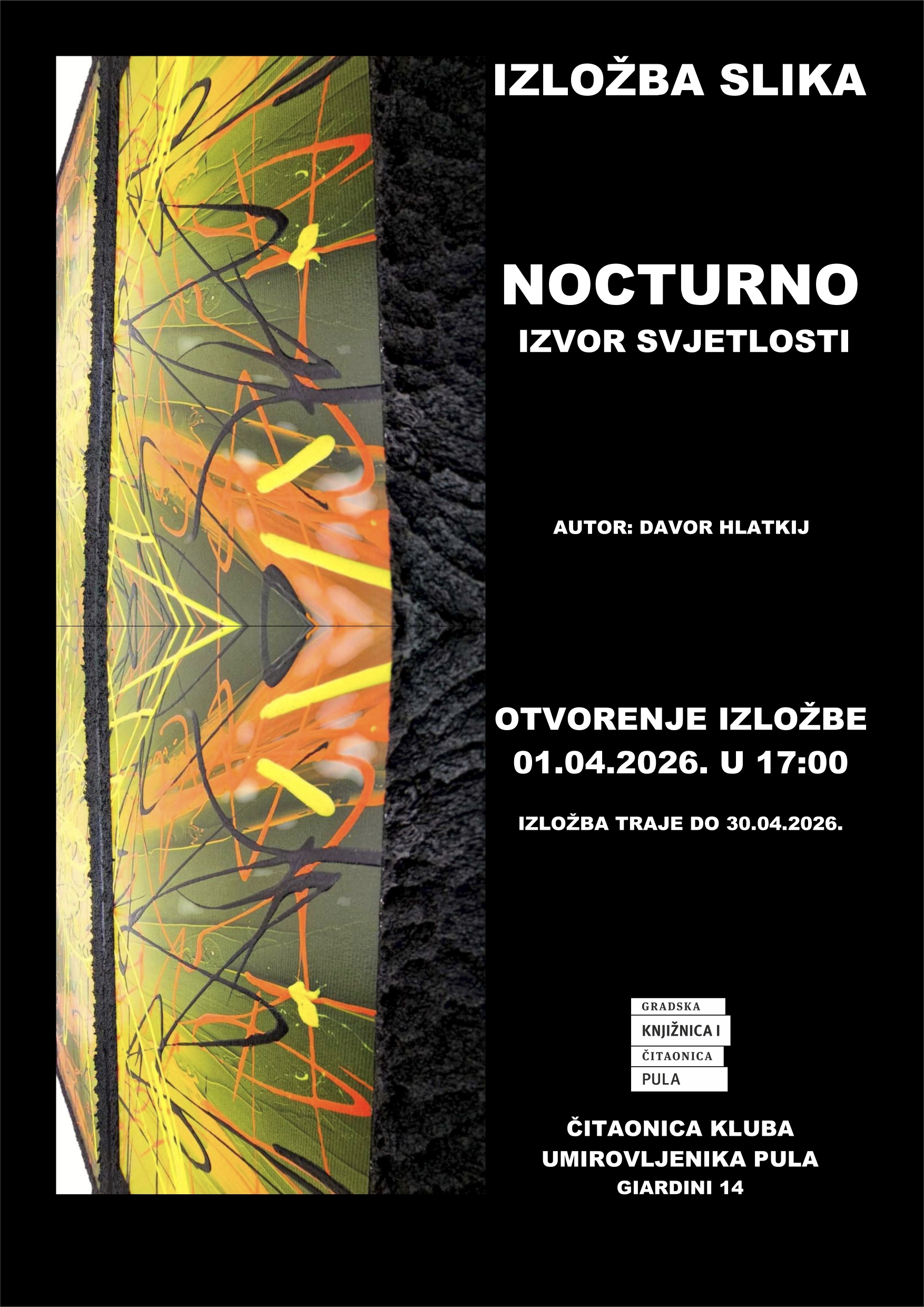 U Čitaonici Kluba umirovljenika (Giardini 14) u srijedu, 1. travnja 2026. u 17 sati bit će otvorena izložba radova Nocturno – izvor svjetlosti autora Davora Hlatkija.