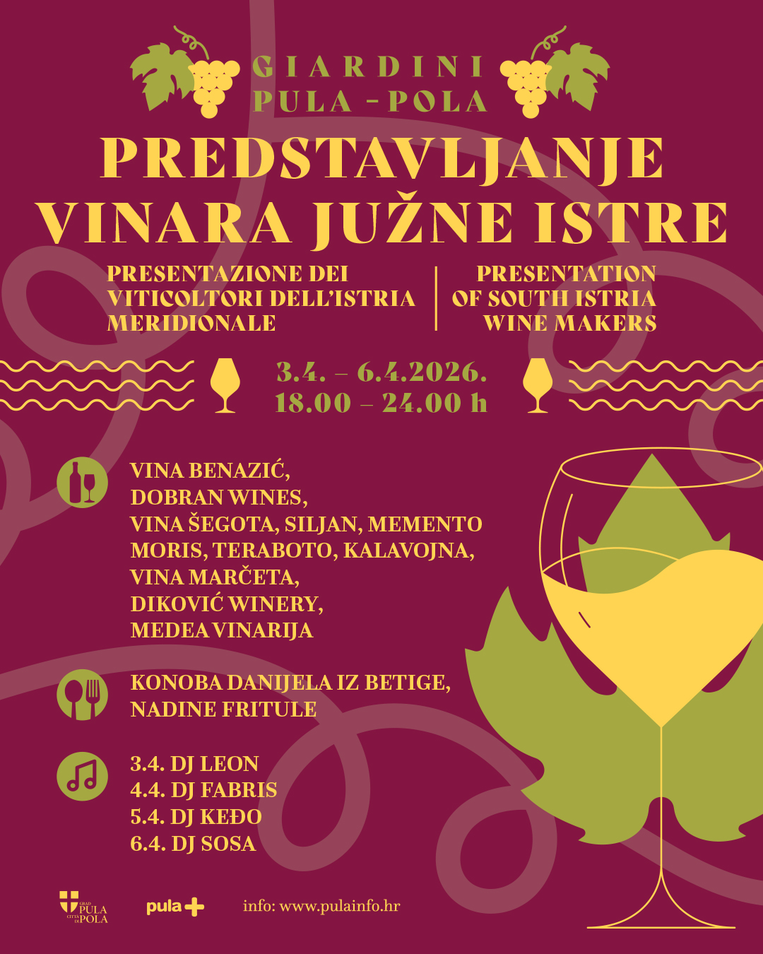 Tijekom uskrsnog vikenda, od petka 3. travnja do ponedjeljka 6. travnja od 18:00 sati do ponoći  Giardini u Puli postaje središte vrhunske vinske i gastronomske ponude.
