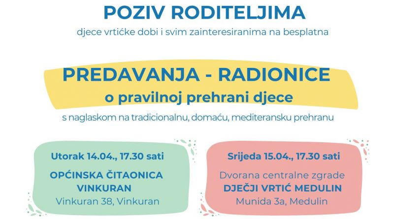 Prvo je na rasporedu u utorak 14.04. s početkom u 17.30 sati u prostoru Općinske čitaonice u Vinkuranu (Vinkuran 38), a drugo u srijedu 15.04. s početkom u 17.30 sati u dvorani centralne zgrade Dječjeg vrtića Medulin (Munida 3A, Medulin). Ulaz je slobodan i nije potrebna prijava.