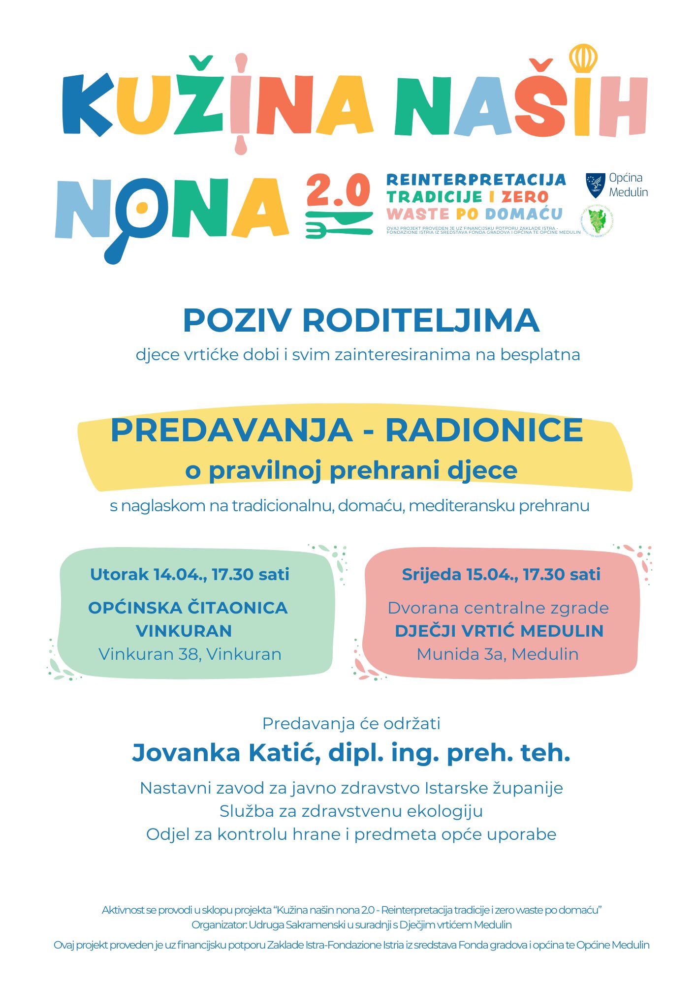 U sklopu projekta „Kužina našin nona 2.0 – Reinterpretacija tradicije i zero waste po domaću“ kojeg u partnerstvu s Dječjim vrtićem Medulin te Udrugom ljubitelja fotografije Format provodi Udruga Sakramenski, idući će tjedan biti održana dva predavanja o pravilnoj prehrani djece, namijenjena roditeljima djece vrtićke dobi, ali otvorena i za sve zainteresirane za ovu temu.