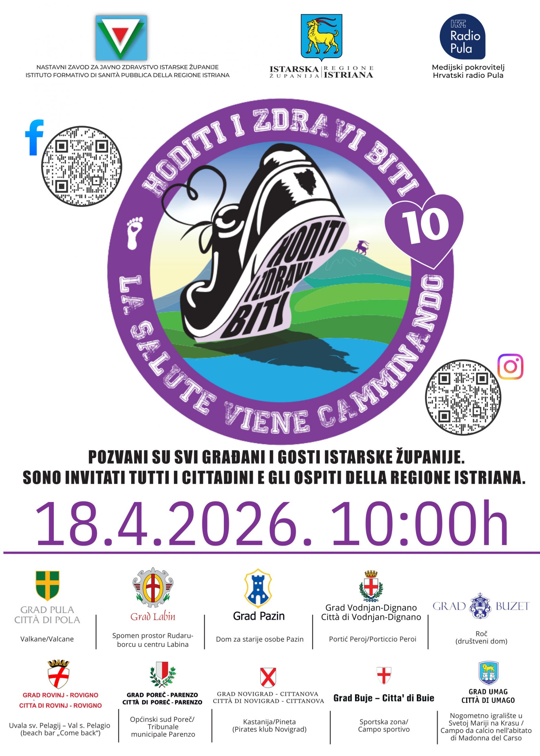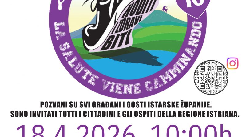 Grad Vodnjan-Dignano, u suradnji s Nastavnim zavodom za javno zdravstvo Istarske županije, orgaizira jubilarno, 10. izdanje manifestacije “HODITI I ZDRAVI BITI – LA SALUTE VIEN CAMMINANDO” te s velikim zadovoljstvom poziva sve građane da se pridruže ovom događanju u subotu, 18. travnja 2026. godine. Ovom prigodom želimo zajedno proslaviti ovaj važan jubilej i poslati snažnu poruku o važnosti zdravlja, kretanja, zajedništva i brige za kvalitetom života u našoj zajednici