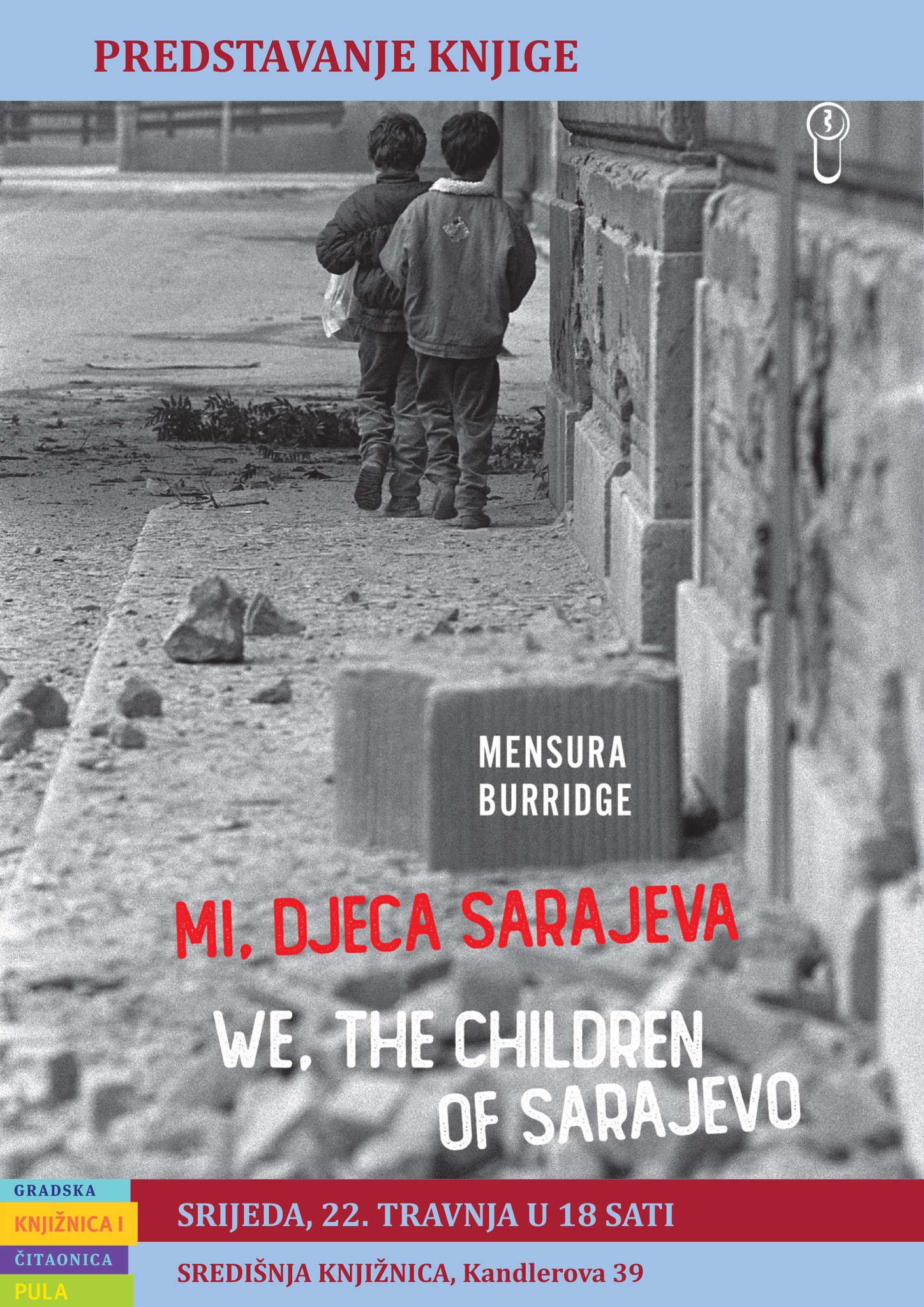 Uoči manifestacije Noć knjige, koja se ove godine održava pod krilaticom “Pobratimstvo lica u sveMIRu”, u Središnjoj knjižnici u srijedu, 22. travnja 2026. u 18 sati bit će održana večer književnosti i sjećanja uz predstavljanje knjige Mi, djeca Sarajeva – We, the children of Sarajevo, autorice Mensure Burridge.
