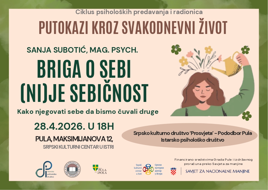 Prvo predavanje „Briga o sebi (ni)je sebičnost? – Kako njegovati sebe da bismo čuvali druge“ održat će Sanja Subotić, magistra psihologije i predsjednica Istarskog psihološkog društva 28. travnja 2026. u 18 sati u Puli u prostoru Srpskog kulturnog centra u Istri (Maksimijanova 12).